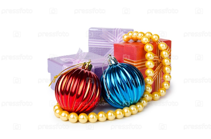 Новогодние игрушки и подарки на белом фоне