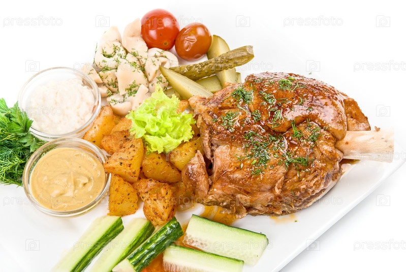 Вкусное блюдо из свинины с овощами на белом фоне