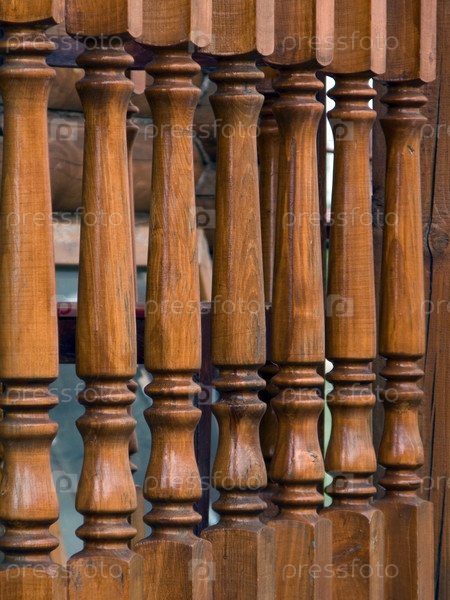 Деревянные фигурные перила вдоль ступенек лестницы, ведущей к двери