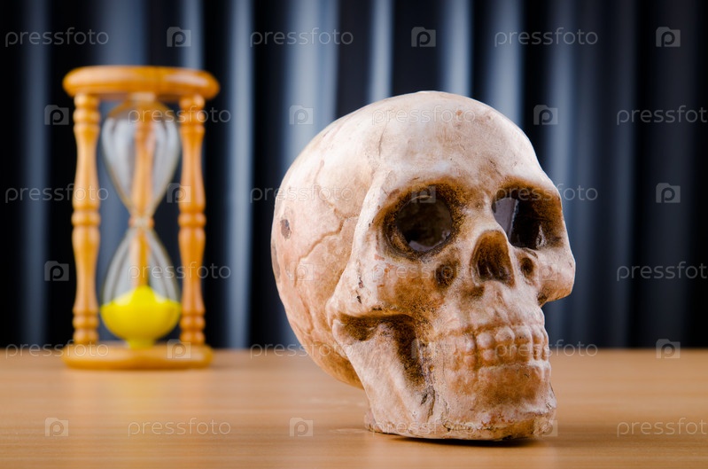 Песочные часы и череп на фоне занавеса