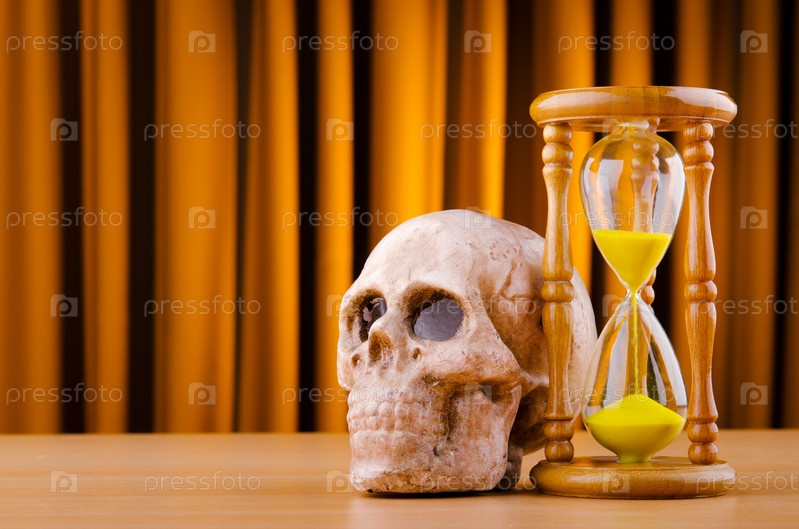 Песочные часы и череп на фоне занавеса