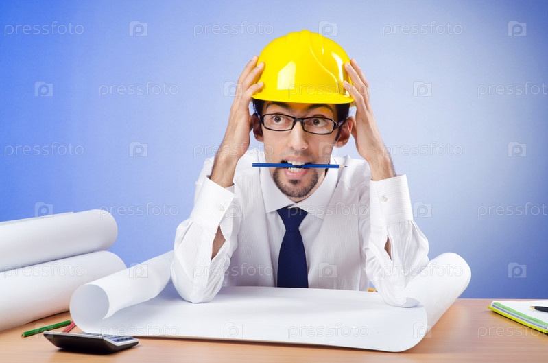 Озадаченный молодой инженер с чертежами и карандашом в зубах