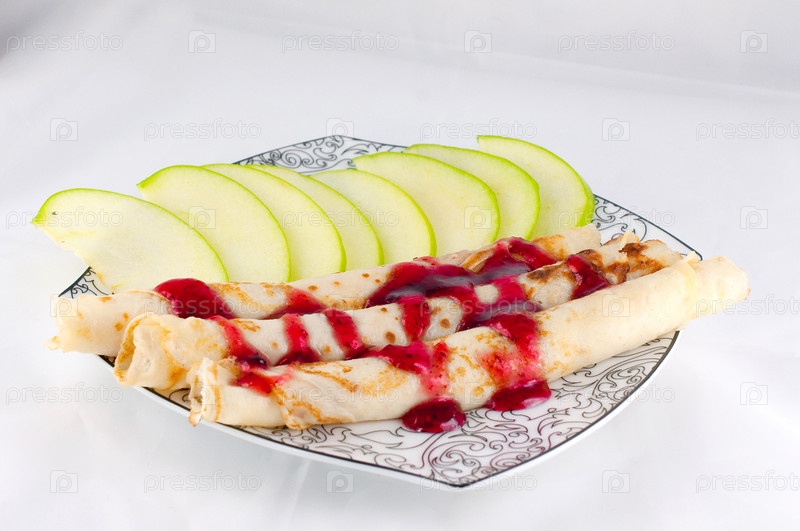 Блины с джемом и яблоками на тарелке