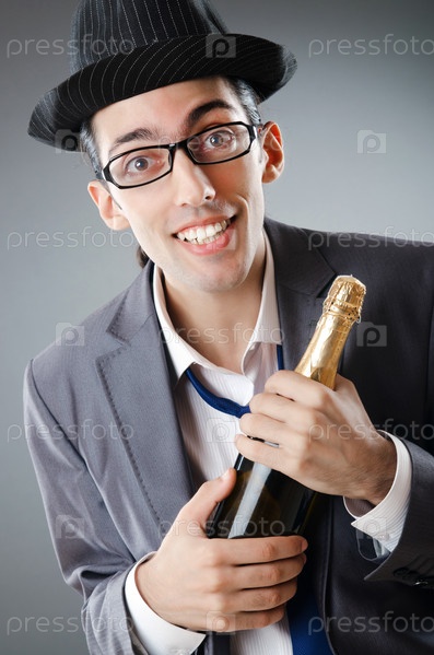 Бизнесмен в шляпе с бутылкой шампанского