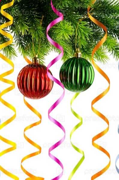 Еловая ветка с новогодними украшениями на белом фоне