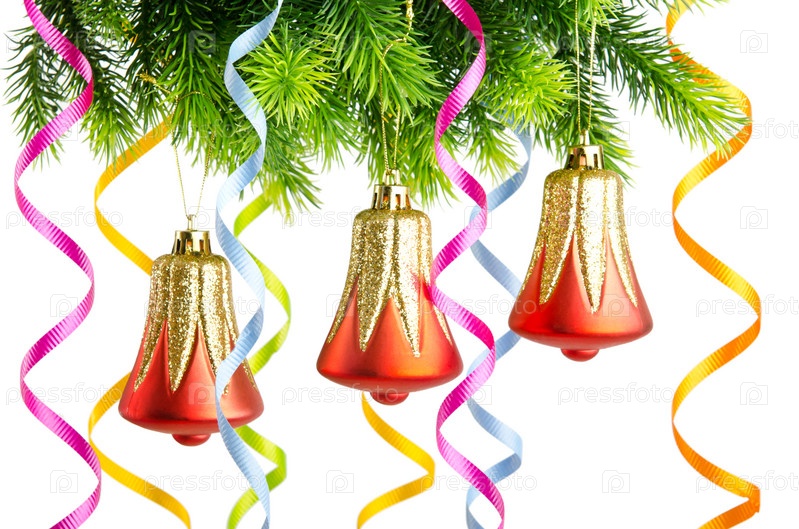 Еловая ветка с новогодними украшениями на белом фоне