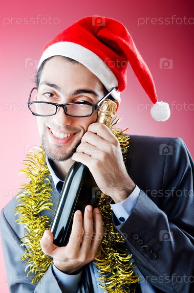 Молодой бизнесмен в новогодней шапке с бутылкой шампанского