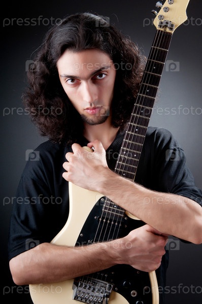 Молодой гитарист на черном фоне