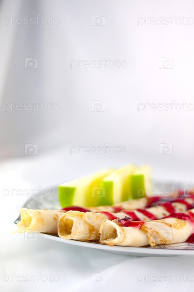 Блины с джемом и яблоками на тарелке на белом фоне