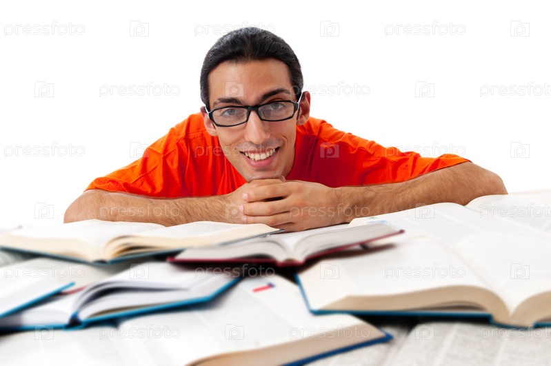 Студент с кучей книг на белом фоне