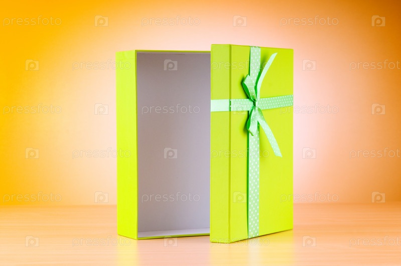 Открытая зеленая подарочная коробка на деревянном столе