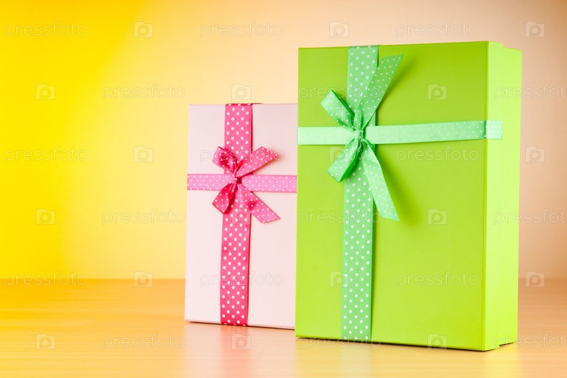 Два подарка в цветных коробках на деревянном столе
