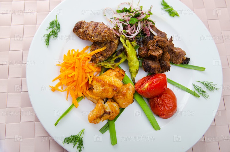 Шашлык с овощами и зеленью на тарелке