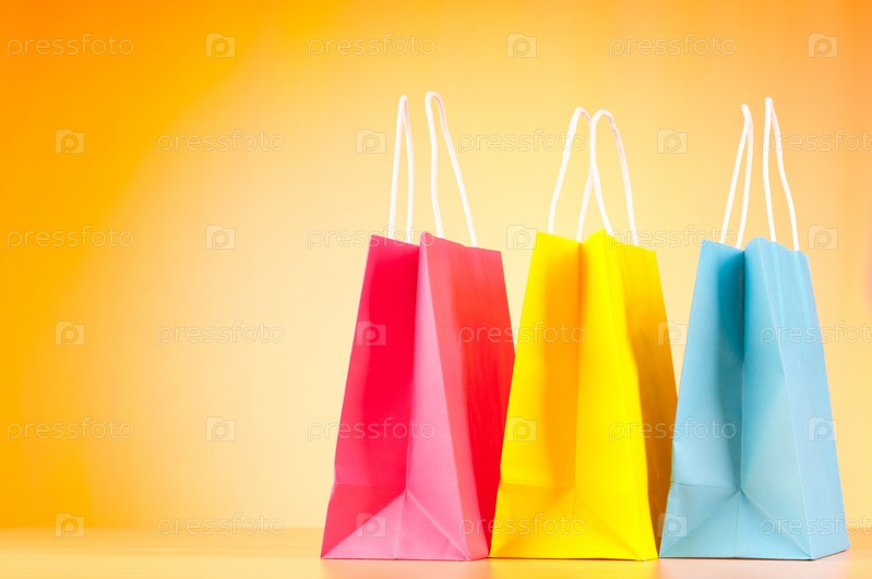 Три цветных бумажных пакета на светло-коричневом фоне