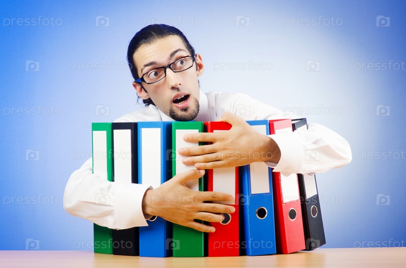 Бизнесмен в офисе с охапкой цветных папок