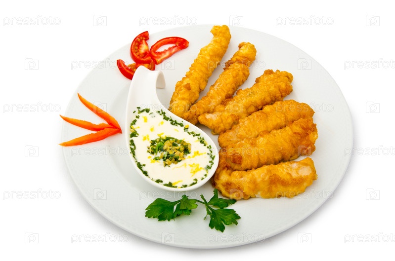 Жареные куриные палочки и овощная приправа на тарелке, белый фон
