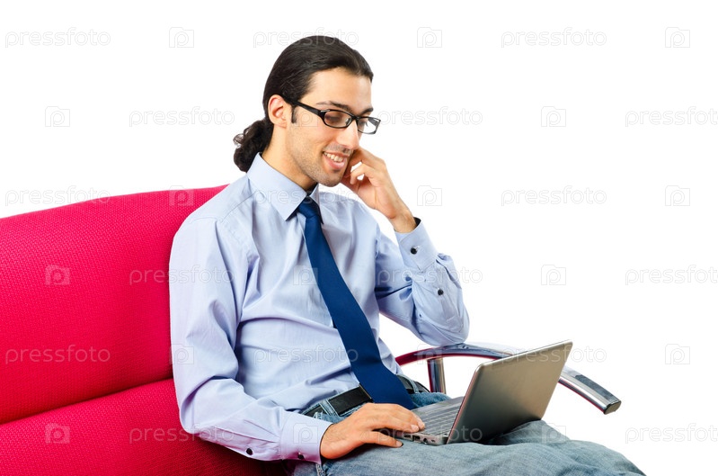 Мужчина с ноутбуком сидит на диване