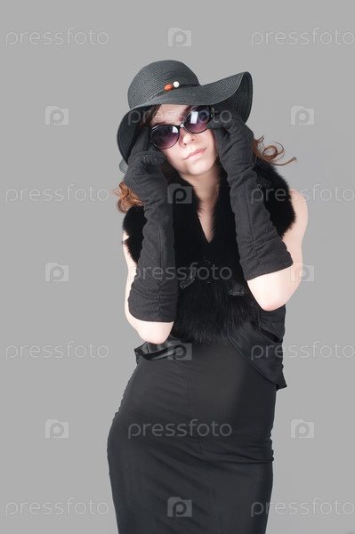 Портрет молодой симпатичной женщины в платье и шляпе на сером фоне