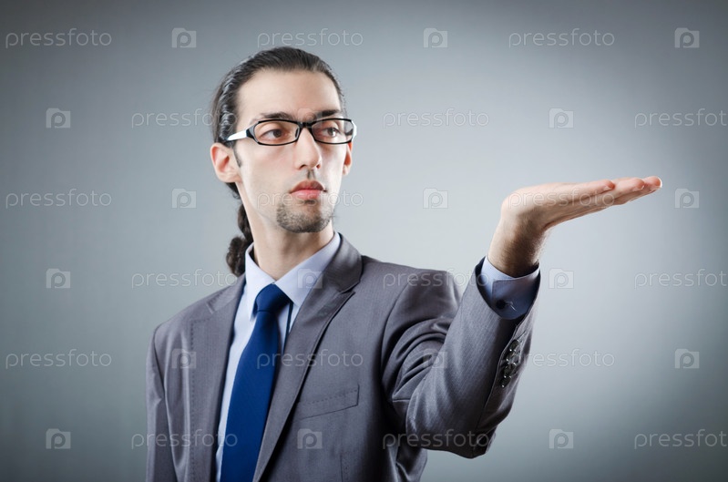 Молодой бизнесмен показывает что-то на ладони, серый фон