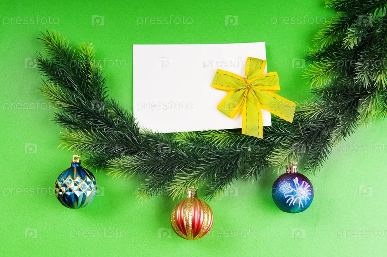 Чистый лист, елочные украшения и еловая ветка на зеленом фоне