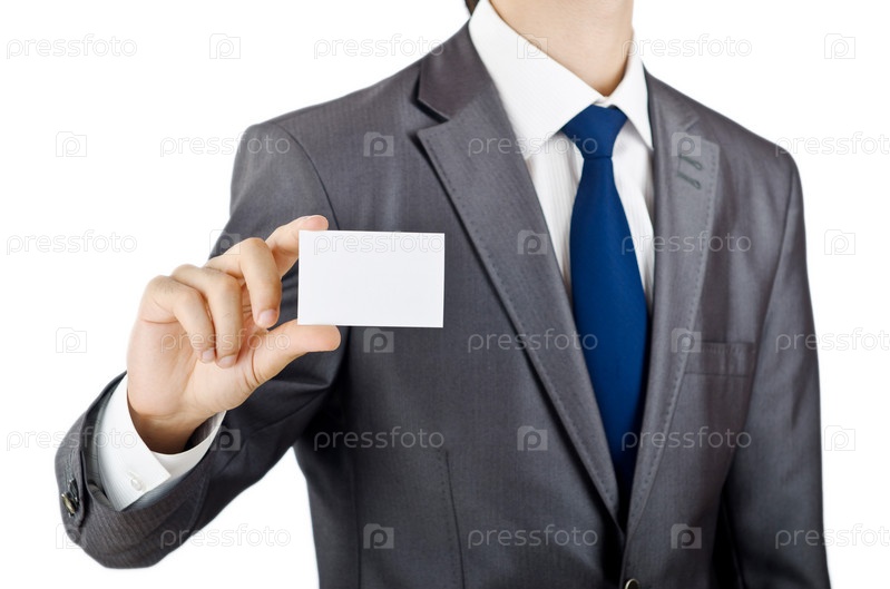 Бизнесмен с пустой визитной карточкой на сером фоне