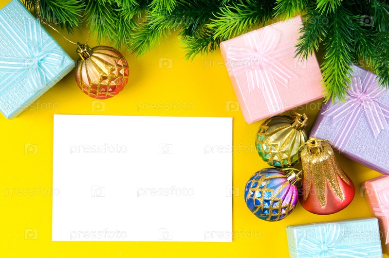 Чистый лист, елочные украшения и еловая ветка на желтом фоне