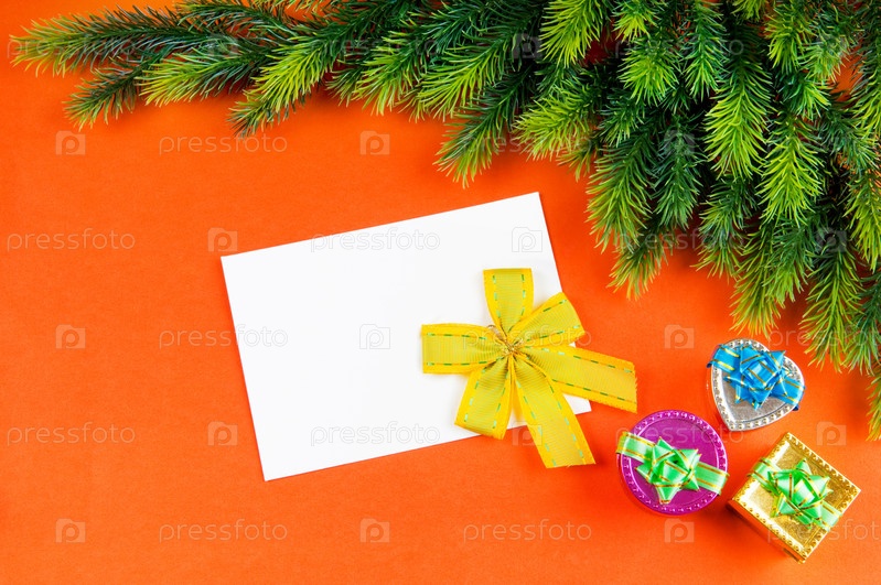 Чистый лист, елочные украшения и еловая ветка на оранжевом фоне