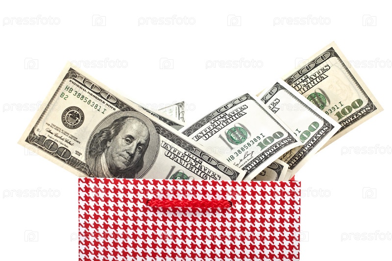 Красный подарочный пакет с американскими долларами, изолированные на белом фоне вблизи