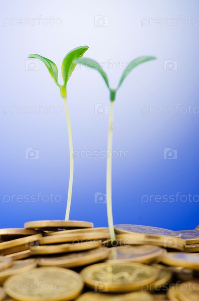 Зеленые ростки, растущие из кучи монет