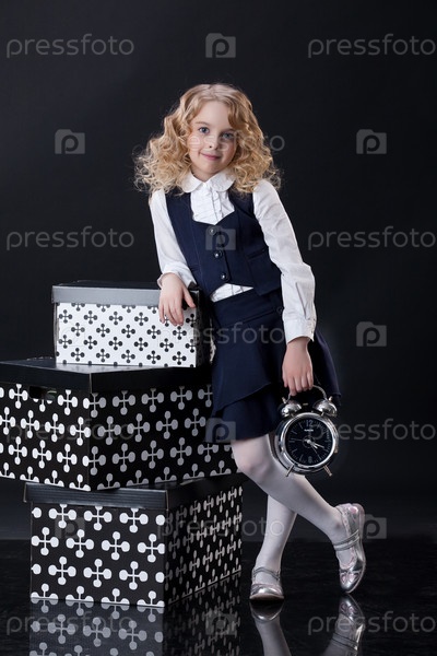 Красивая блондинка, держащая большой будильник