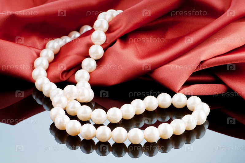 Жемчужное ожерелье и красный атлас на зеркальной поверхности