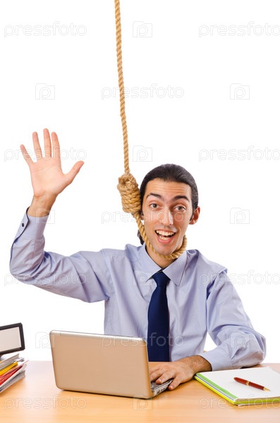 Молодой бизнесмен сидит за рабочим столом с петлей на шее, белый фон