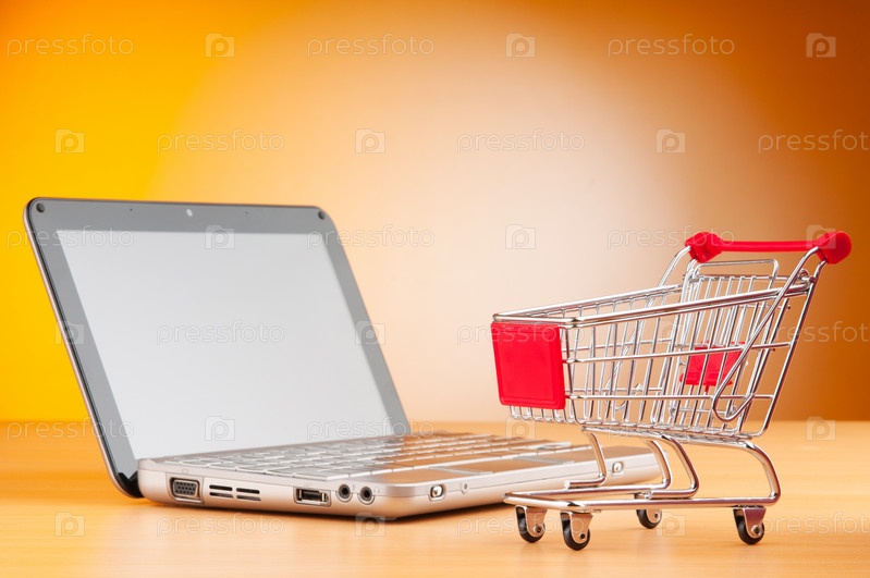 Тележка для покупок и ноутбук на желтом фоне