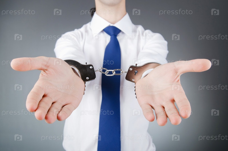 Бизнесмен в наручниках на сером фоне