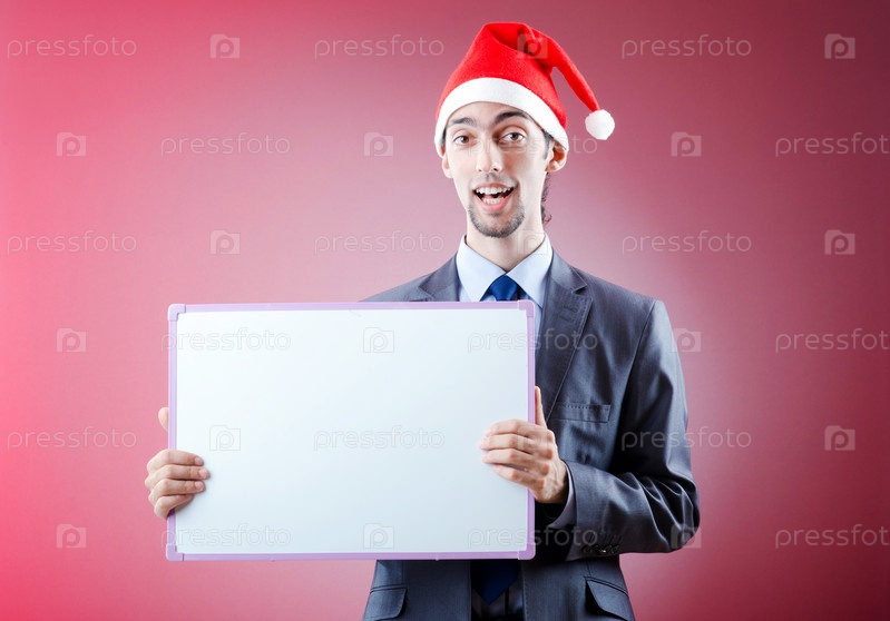 Бизнесмен в колпаке Деда Мороза с пустым плакатом на розовом фоне
