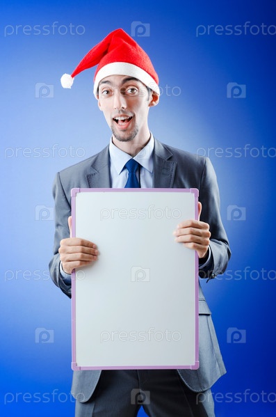 Бизнесмен в колпаке Деда Мороза с пустым плакатом на синем фоне