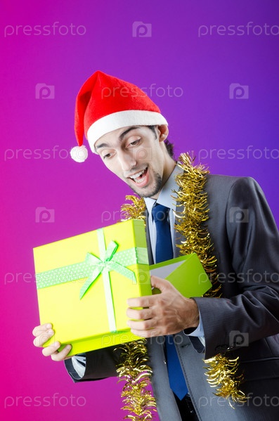Бизнесмен в колпаке Деда Мороза с подарками на фиолетовом фоне
