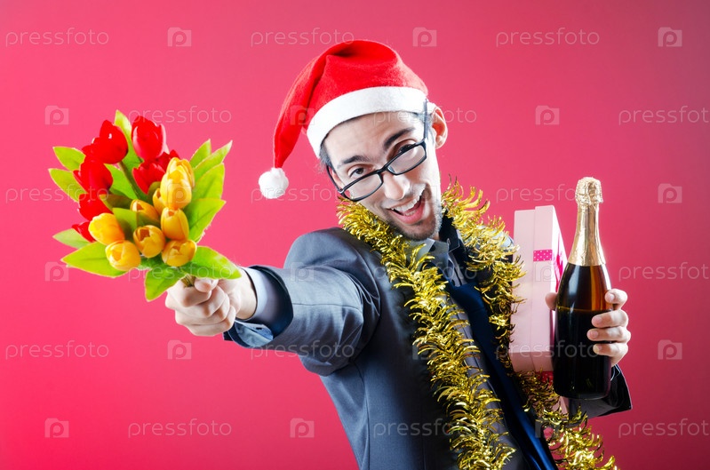 Мужчина в новогоднем колпаке с подарками на розовом фоне