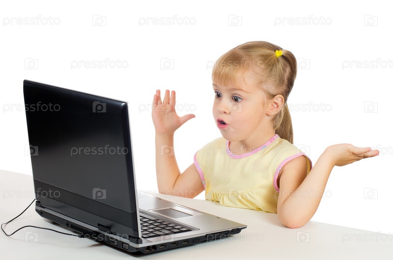 Маленькая девочка с удивленным лицом перед компьютером