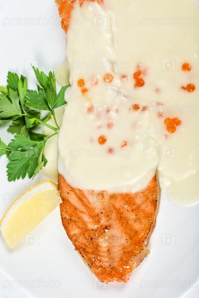 Стейк из лосося с сырным соусом, зеленью, лимоном и красной икрой