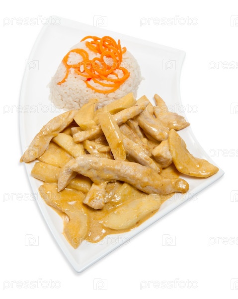 Жареная курица и рис на белом фоне