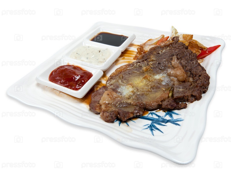 Стейк из говядины и соусы на белом фоне