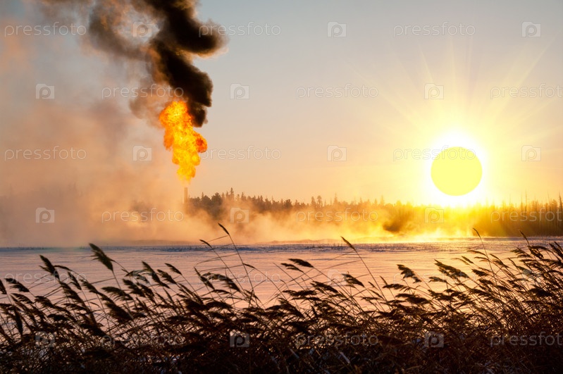 Факельное сжигание газа. Восход солнца. Испарение снега