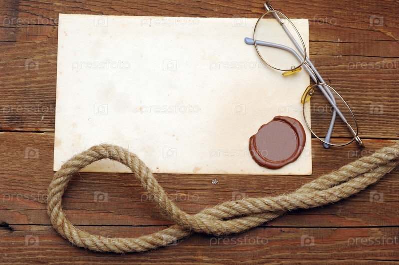 Старый лист бумаги с сургучной печатью, очки и веревка