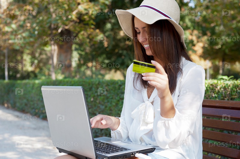 Элегантная женщина с кредитной картой и ноутбуком в парке