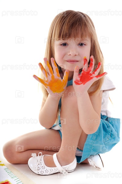 Маленькая девочка рисует на белом фоне