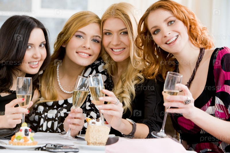 Портрет четырех подруг, держащих напитки и смотрящих на камеру