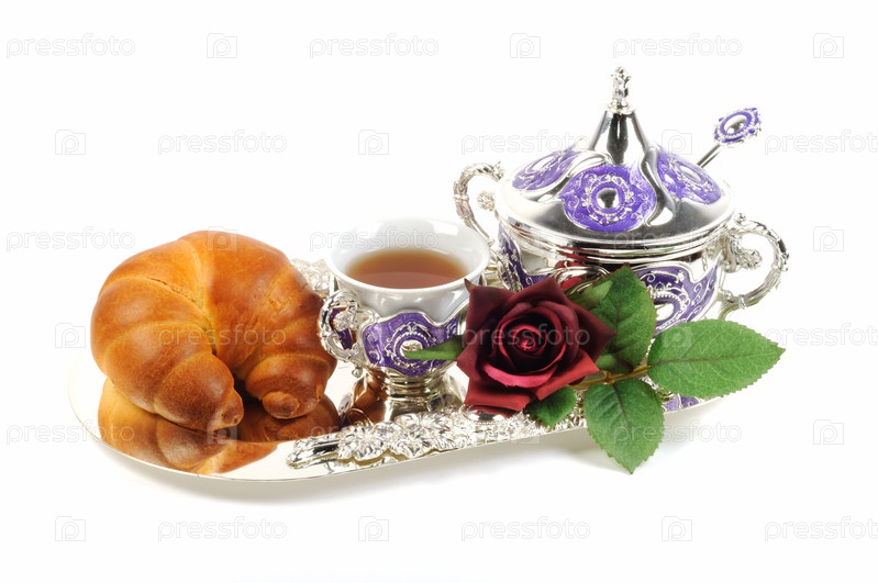Свежий круассан и чай на разносе на белом фоне