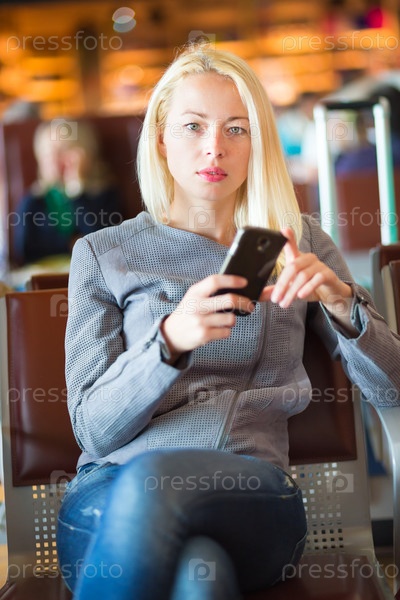 Женщины путешественник с помощью мобильного телефона во время ожидания