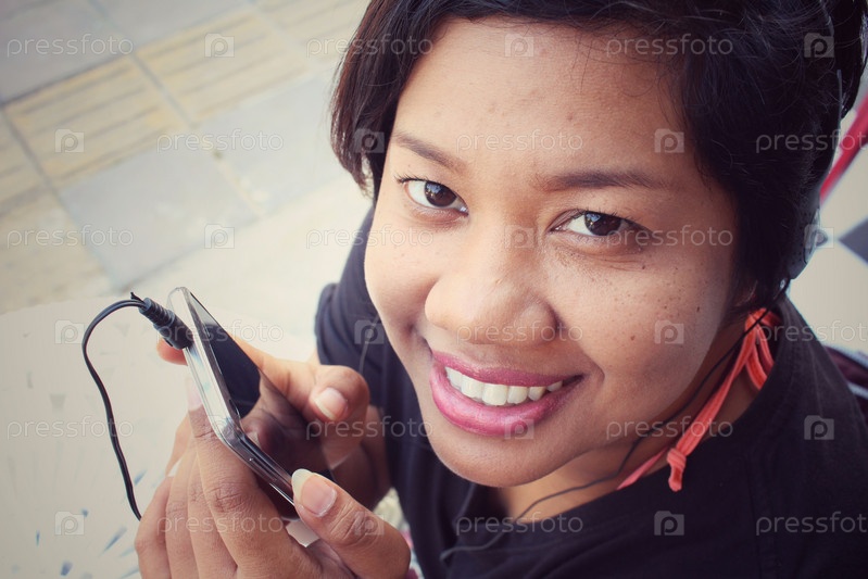 Женщина, прослушивания музыки на наушники с смарт-телефон